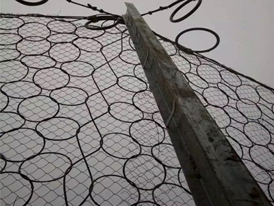 環(huán)形網(wǎng)是有單根鋼絲盤結(jié)而成兩端頭間搭接長度不小于100mm。盤結(jié)而成的環(huán)用鋼質(zhì)或鋁合金緊固件至少在均勻分布的三處箍緊,且其中一處位于兩端頭的搭接處,除邊緣環(huán)孔外,每個環(huán)與其周邊的4個環(huán)相扣聯(lián)。單機(jī)具即可進(jìn)行系統(tǒng)的安裝、維修和部件更換。